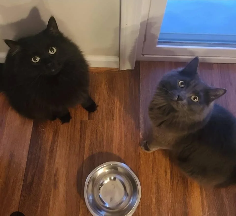 Pancake & Waffles (formerly Buddha)- I adopted Pancake (black) 1st, we kept his name it was too cute to change. He is my fluffy soulmate. 2 years later we adopted Waffles. He is my naughty boy. Always getting into things. -